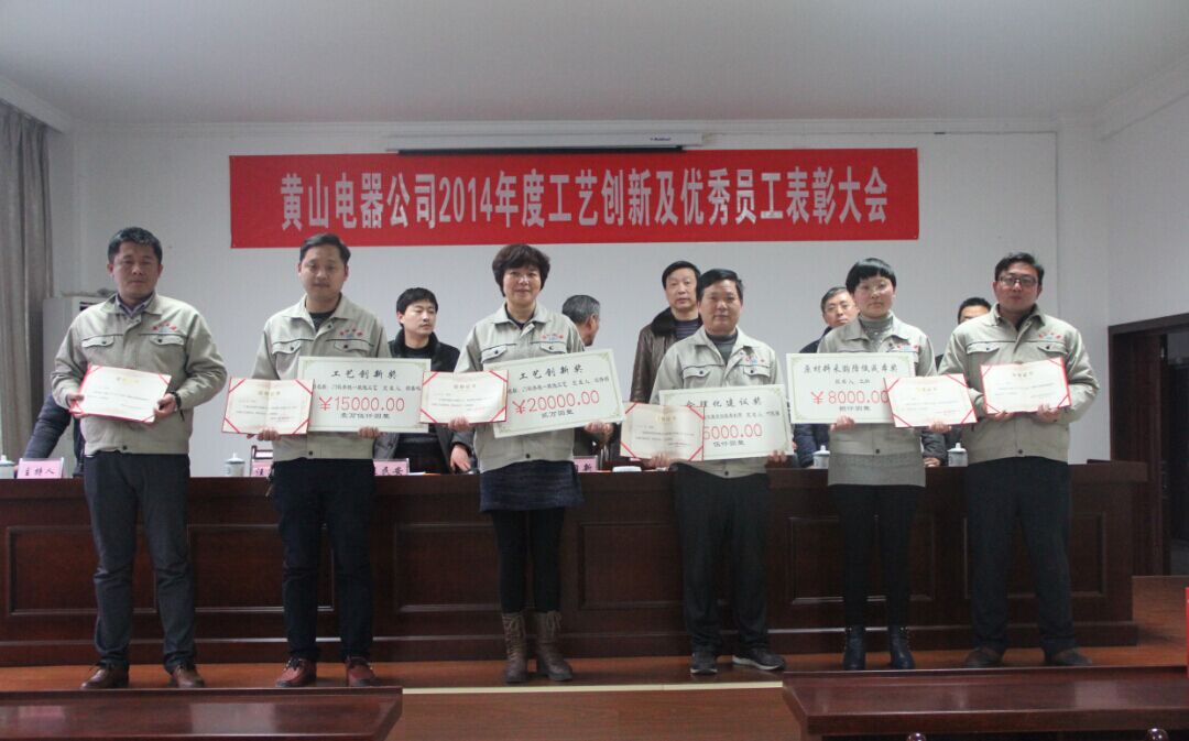 2014年3月4日上午黃山電器公司在四樓會議室召開了“2014年度工藝創新暨優秀員工表彰大會”,并邀請縣經信委領導汪光輝參加。會上,汪杏娟、鄭春鳴同志分別獲得了“2014年度工藝創新獎”,葉民強同志獲得了“2014年度合理化建議獎”,王納同志獲得了“原材料采購降低成本獎”。同時芯片一部擴散、腐
